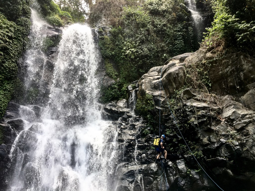 Sutartą dieną stačiais serpantinais atvykstame į bazę, kurioje tvyro įkvepianti, atsipalaidavusių besišypsančių žmonių energija. Dar paaiškina maršrutą ir jo ypatybes ir mes su visa įranga vietinio vairuotojo vežami jau dardame priekaboje siaurais keliukais. Pats maršrutas tikrai paprastas ir Rokui persilaužus pirmame jo ne itin mėgstamame virvių nusileidime 28m, turbūt optimistiškai nuteikia, jog ilgiausia virvė jau praeity, mėgaujamės smagiai judėdami į priekį. Daug ėjimo, vandens nėra daug. Bet keletas tikrai įspūdingų reginių su šniokšiančiais kriokliais šalia apžavi visus mus. Pagal aprašymą 3,5 val. maršrutą įveikiame per 2,20 val. ir įkopę į aukštą stačią kalną skambiname išsikviesti mašinos, o kai klausia – kur mes. Paaiškinu prie šventyklos ir nedidelio namuko, jie nieko nesupranta ir paršo atsiųsti koordinates. Greit suprantame kodėl, kopdami toliau tokių šventykla ir namukas praeiname vieną po kito. Juk Balyje kiekviename name yra asmeninė šventyklėlė, o kiekviename kaime būtinai ir dar trys didelės ž miesto pradžioje, viduryje, gale. Tad pakeliui sulaukiame mašinos ir laimingi grįžtame į bazę. Čia dar mums pasiūlo ir per keletą min. paruošia nuostabius vietinius pietus. Ir pasirodo išėję nepusryčiavę jau buvome išalkę.